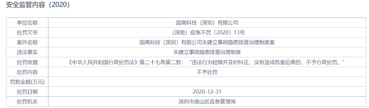 据(深南)应急不罚〔2020〕13号显示,深圳市南山区应急管理局曾在2020年12月31日,因固高科技未建立事故隐患排查治理制度对公司出具应急不罚的文件。