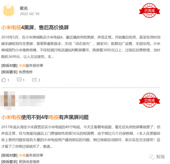 今年“315”前夕,有用户向财熵反映,“前几年买的小米电视刚过完保修期就出现黑屏,打电话报修,说是要更换主板,还得自费。这种情况不止我一个人,其他人也有类似的问题出现。”