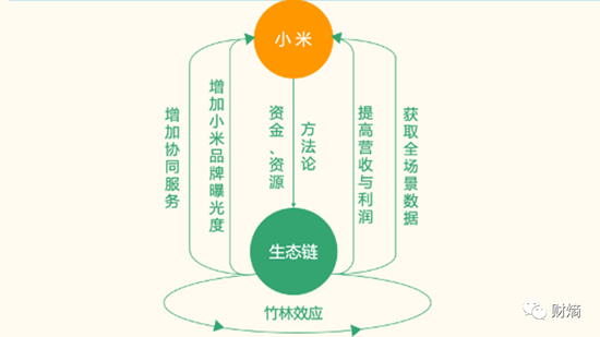 在《笔记》中,小米用“竹林效应”定义自己与生态链之间的关系:“小米通过竹林发达的根系,向生态链企业输送各自养分,而这片竹林中的竹子,又通过底下根系交织在一起”。