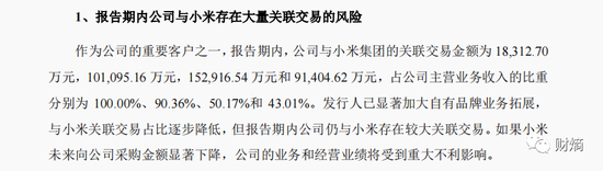 财熵注意到,许多筹备或已经上市的小米生态链企业,在其招股书中大多都会提及“与小米存在大量关联交易”、“销售渠道过于单一且过于依赖小米科技”等风险。也有部分企业的上市梦因此夭折,如为小米代工耳机的万魔声学,就曾因对关联方依赖度较高而重组上市失败。