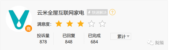 财熵注意到,在黑猫投诉平台上,截至3月12日,消费者对“云米全屋互联网家电”的投诉量高达878条。而作为小米生态链企业上的一环,云米在品控上的滑坡,也对小米的口碑造成了一定的负面影响。