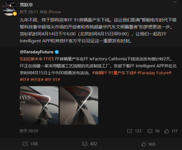 这则跳票公告没有提供中文版,也没有出现在最近活跃度颇高的FF公司微博、微信公众号,更没有登上贾跃亭个人的微博账号页面。在贾跃亭昨日更新的“九年不屈,终于即将迎来FF 91首辆量产车下线”微博,收获了近千的点赞量。