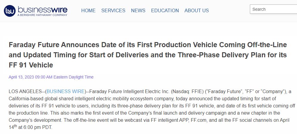 根据FARADAY FUTURE(简称“FF公司”,中文为“法拉第未来”)在美国新闻稿发布网站Business Wire发布的通告称,某些供应商通知公司,他们将无法满足公司的时间要求,因此公司更新了 FF 91车辆的开始交付时间以及此前公布的三阶段交付计划。