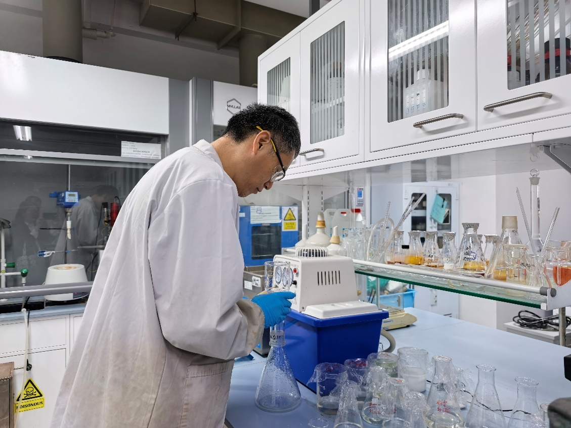 走进绿色化工研究部,50岁出头的张广积研究员正微倾着高大的身躯,双手在烧杯与试管间灵活穿梭。他的头发已有些花白,眼神专注,脸上始终挂着谦和的微笑。“有些菌得‘照顾’,实验室假期也不能全关闭。”他指着一台恒温振荡培养箱,箱内四个烧瓶盛着不同颜色的液体,随着设备节奏轻轻晃动。