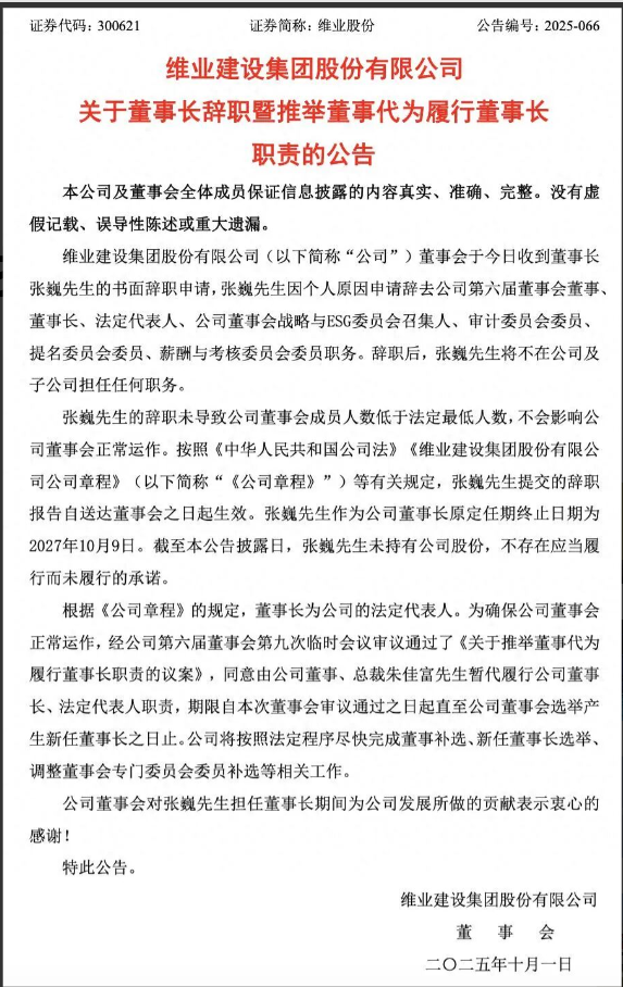 9月30日,建筑装饰行业的上市公司维业股份(300621)骤然发布公告,董事长张巍因个人缘由辞去公司所有职务,这一消息迅速引发了市场的广泛关注。