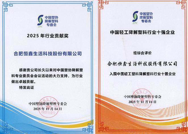 合肥恒鑫生活科技股份有限公司(简称:恒鑫生活)获得了“2025年行业贡献奖”和“最佳合作奖,同时与安徽恒鑫环保新材料有限公司一道,共同入围了中国轻工降解塑料行业十强企业,这是公司连续入围的第六个年头。长久以来,恒鑫生活秉承着力于中国环保事业的无尽追求,立足更深远解决中国塑料行业降解难点的目标,不断创新,深化降解工艺,为行业做出卓越贡献。