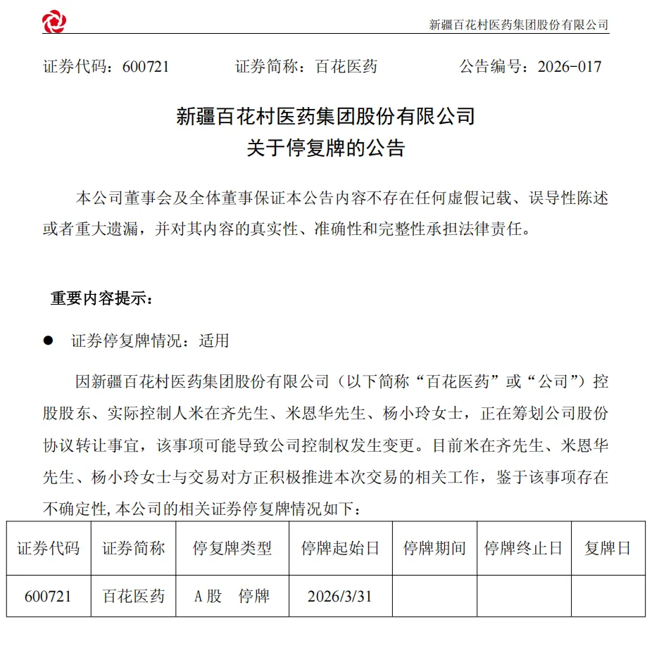 3月30日晚间,百花医药(600721.SH)公告称,公司控股股东、实控人米在齐、米恩华、杨小玲正在筹划股份协议转让事宜,该事项可能导致公司控制权发生变更。